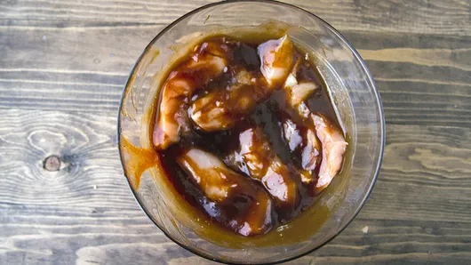 Step2If desired, lightly salt chicken tenders. In medium bowl, stir together barbecue sauce and water. Place chicken in mixture; turn to coat.
