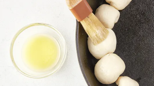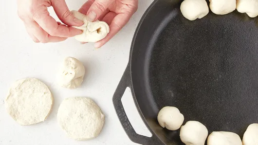 Heat oven to 350°F. Spray 12-inch ovenproof skillet with cooking spray. Separate dough into 8 biscuits. Separate each biscuit into 2 layers, to make 16 biscuit rounds. Gather ends of each biscuit round, and gently pinch to seal; roll into ball. Place around edge of skillet with pinched end facing down.