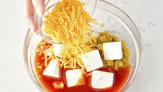 Meanwhile, in large microwavable bowl, mix chicken, cream cheese, enchilada sauce, green chiles and 1/2 cup of the cheddar cheese. Cover with plastic wrap and vent. Microwave on High 4 to 6 minutes, stirring every 60 seconds, until mixture is steaming hot.