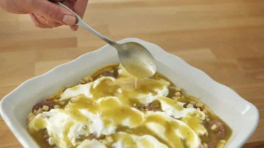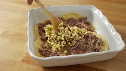 A layered tortilla, pulled pork casserole rich with green chile enchilada sauce and sour cream.