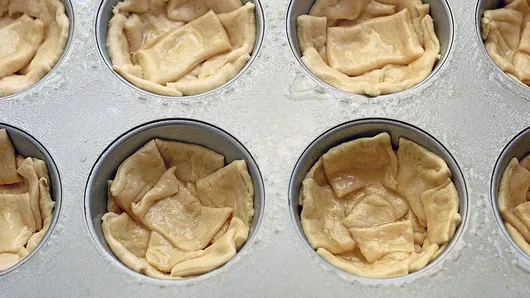Step4Melt 2 tablespoons butter. Add 20 mini squares crescent dough to bottom and halfway up side of each muffin cup; brush butter on each square as an adhesive.