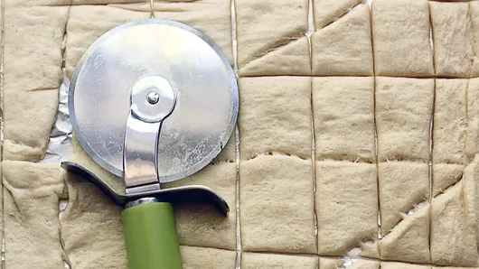 Step3Unroll 1 can (8 oz) Pillsbury™ refrigerated crescent dinner rolls on work surface; press perforations to seal. Cut dough into 8 squares. Cut each of the squares into 5 rows by 4 rows to make 20 mini squares each.