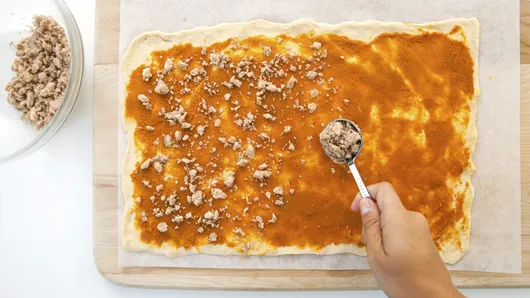 Step3Unroll dough on work surface; press into 15x9-inch rectangle (if using crescent rolls, press seams to seal). Spread pumpkin evenly over dough to within 1/4 inch of edges. Sprinkle with 3 tablespoons of the sugar mixture.