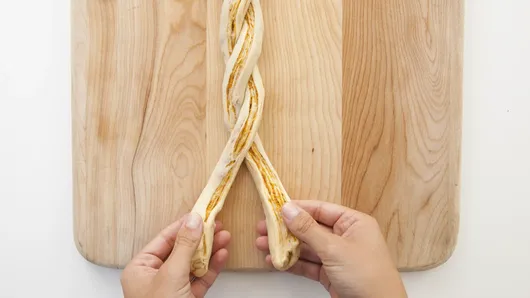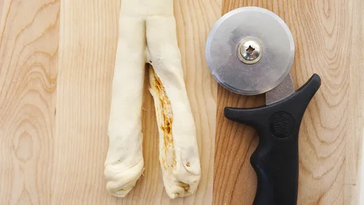 Step4Roll dough up starting at one long side; pinch seam to seal. Using sharp knife or pizza cutter, slice dough lengthwise all the way through.