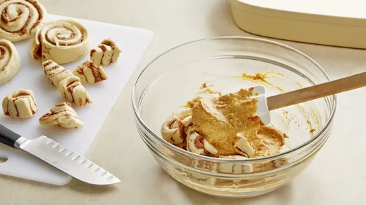 Step3Separate dough into 5 rolls; set aside icing. Cut each cinnamon roll into 6 pieces; gently stir into pumpkin mixture. Spoon into baking dish.