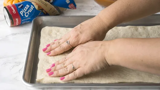 Step2Unroll 1 can (13.8 oz) Pillsbury™ refrigerated classic pizza crust onto cookie sheet; press to 14x9-inch rectangle. Bake 8 minutes.