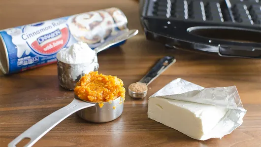 Step1Heat waffle maker. Meanwhile, in medium bowl, mix 1/4 cup canned pumpkin (not pumpkin pie mix), 4 oz cream cheese, softened, 1/4 cup powdered sugar and 1/2 teaspoon pumpkin pie spice until smooth.