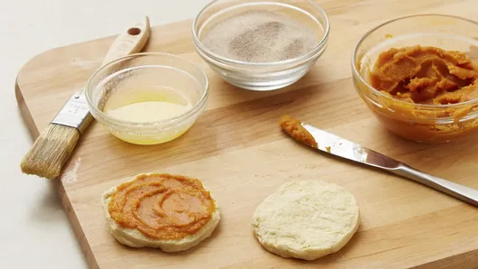 Step2Separate dough into 8 biscuits. Separate each biscuit into 2 layers, making total of 16 biscuit rounds. Brush one side of each biscuit round with melted butter. Spread slightly less than 1 tablespoon pumpkin pie mix on top of each. Sprinkle rounds with spice-sugar mixture.