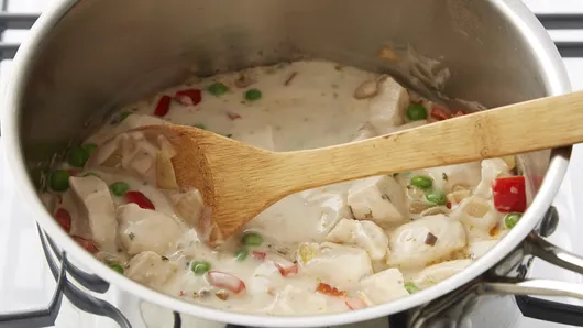 Our 20-minute recipe makes a classic dish like Chicken à la King simple enough for any night of the week. Top fresh-baked biscuits with hearty chicken and fresh veggies in a rich cream sauce (made with one of our favorite shortcut ingredients ever). It's everything you need for a complete meal–no sides required.