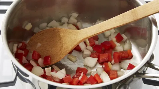 Step2Meanwhile, in 4-quart saucepan, heat oil over medium heat. Cook bell pepper and onion in oil 3 to 5 minutes, stirring occasionally, until tender.