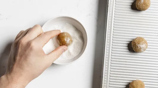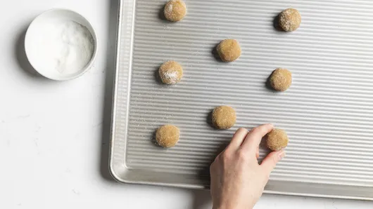 Heat oven to 350°F. Shape dough into 36 (1-inch) balls; roll in sugar.
