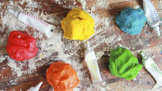 Step2Divide dough into 5 equal parts. Tint each with a different gel food color (red, orange [mix red and yellow], yellow, green, blue), and add 2 tablespoons of the flour to each to keep from becoming overly sticky. (DO NOT EAT RAW COOKIE DOUGH AFTER COMBINING WITH FLOUR.)