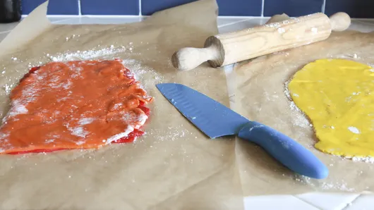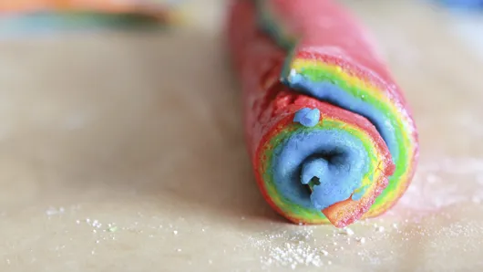 Step3On work surface, place 2 pieces cooking parchment paper. Sprinkle a bit of the remaining flour onto 1 of the pieces of parchment paper. Use rolling pin to roll red dough to 8x3x1/4 inch. Transfer this dough to other piece of parchment paper. Repeat with orange, yellow, green and blue pieces of dough, placing each color on top of the other until they are all stacked in rainbow order--red, orange, yellow, green, blue.