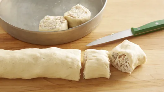 Step3Using sharp knife, cut roll into 8 equal slices; place cut side down in pan. Bake 18 to 22 minutes or until dough is deep golden brown and baked through. Cool 5 minutes in pan; top with green onions.