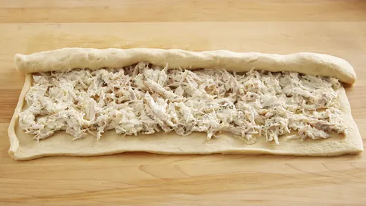 Step2On large cutting board, unroll dough sheet; spread chicken mixture evenly over dough, leaving about 1/2 inch on 1 long side uncovered. Starting with topped long side, roll up dough toward uncovered edge; pinch seam to seal tightly.