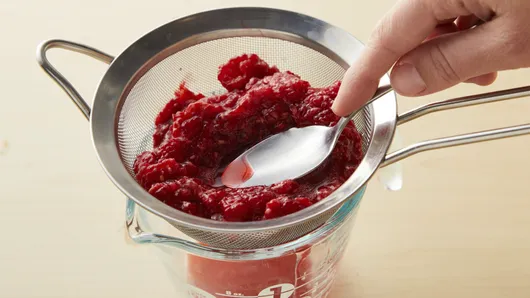 In another small bowl, mash 2 cups raspberries with fork. Push berries through small strainer with back of spoon to make 1/2 cup raspberry puree. Stir puree, lemon juice and food color into remaining filling.