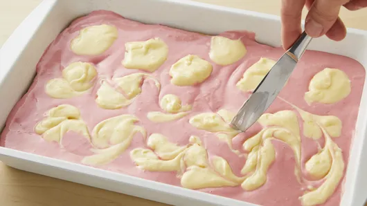 Spread raspberry filling evenly over cookie crust. Drop tablespoonfuls of reserved filling on raspberry filling. With knife, carefully swirl into raspberry filling layer to create marbled look.