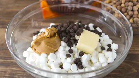 Step2Place cereal in large bowl; set aside. In very large microwavable bowl, place chocolate chips, peanut butter, butter and marshmallows. Microwave on High in 30-second increments, stirring after each, for 1 to 2 minutes or until mixture is thoroughly melted. Mixture will be very sticky.
