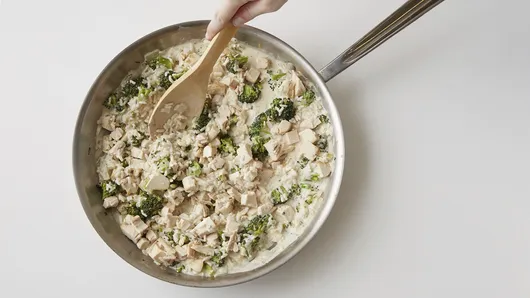 Step3Stir in chicken broth, mustard, cream cheese spread, salt and pepper. Cook and stir 3 to 5 minutes or until mixture is smooth. Stir in chicken and rice; transfer to baking dish.