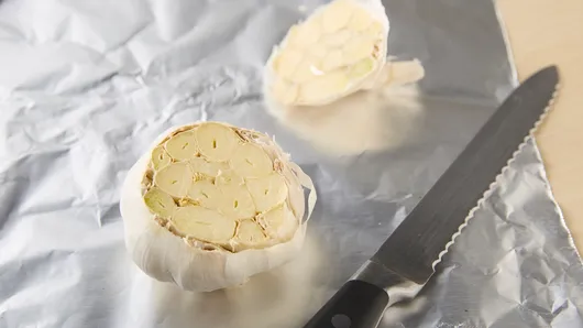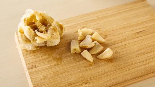 Step2Bake 45 to 50 minutes or until garlic is tender when pierced with a fork. Cool 5 minutes. Gently squeeze garlic out of cloves onto cutting board; finely chop. Set aside.