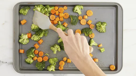 Step2In medium bowl, add broccoli, carrots, olive oil, 1/4 teaspoon salt and 1/8 teaspoon pepper; mix well. Spread in pan in single layer. Bake 10 minutes; stir. Continue baking 8 to 12 minutes or until vegetables are lightly brown and just tender.