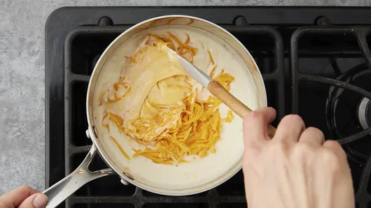 Step3Meanwhile, cook and drain pasta as directed on package. While pasta is cooking, melt 1/4 cup of the butter in 3-quart saucepan over medium-low heat. Stir in flour, 1/2 teaspoon salt and 1/4 teaspoon pepper. Cook over medium-low heat, stirring constantly, until mixture is smooth and bubbly; remove from heat. Stir in milk. Increase heat to medium-high. Heat to boiling, stirring constantly. Boil and stir 1 minute. Stir in cheeses. Cook, stirring constantly, until cheeses are melted; remove from heat.