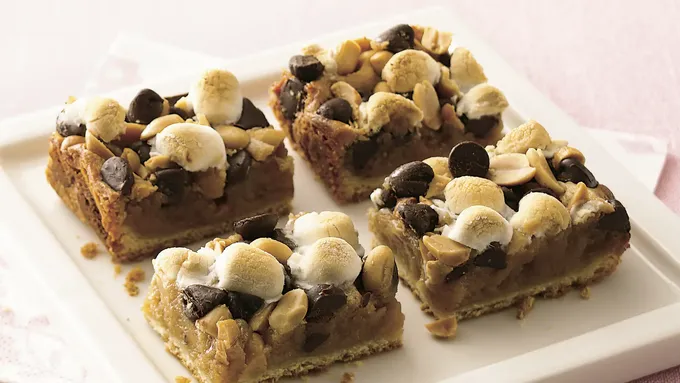 Step2Sprinkle marshmallows, peanuts and chocolate chips evenly over crust. Drizzle with caramel topping.