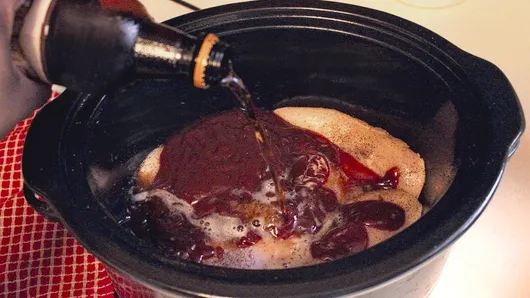 Step2Season chicken breasts on both sides with salt and pepper, and place inside slow cooker. Pour in barbecue sauce and root beer; spread around. Cover and cook on High heat setting 2 hours.