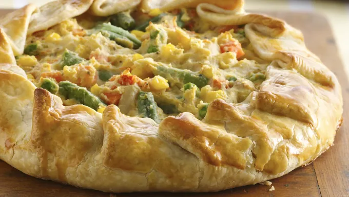 Step2Remove pie crusts from pouches; unroll onto 2 ungreased cookie sheets. Spoon 1 cup mashed potatoes on center of each crust, spreading to within 2 inches of edge. Top with soup mixture, dividing evenly between crusts. Fold crust over edge to form 2-inch border, pleating crust as necessary. Brush crust with beaten egg.