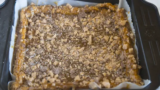 Step3Bake 30 to 35 minutes or until golden and toothpick inserted in center comes out mostly clean. Cool slightly. Pour 1/2 cup caramel sauce over blondies; spread evenly. Sprinkle with 1/3 cup toffee bits and 1 teaspoon sea salt.