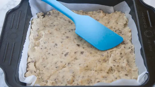 Step2In large bowl, break apart 1 roll (16.5 oz) Pillsbury™ refrigerated sugar cookie dough. Add 1/4 cup all-purpose flour and 1 cup toffee bits. (DO NOT EAT RAW COOKIE DOUGH AFTER COMBINING WITH FLOUR.) Mix until well combined. Press in pan.
