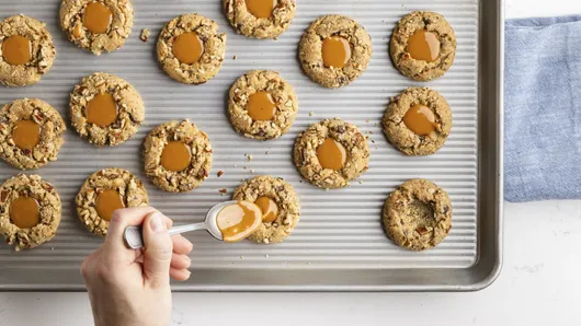 Bake in a 350°F oven for 12 to 16 minutes, until the edges are golden. Right after they come out, use the end of a wooden spoon to make a small indentation in the center of each cookie to hold the caramel.