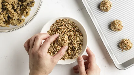 Roll the dough into tablespoon-sized balls. Coat each one in chopped pecans, pressing gently so they stick. Then, arrange the balls on a baking sheet about an inch apart.
