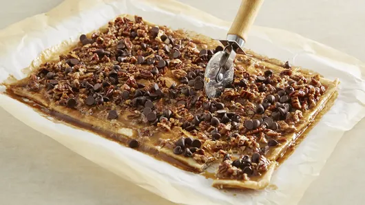 Step3Bake 3 to 5 minutes or until caramel is bubbly in center. Sprinkle with chocolate chips and salt. Cool pan on cooling rack 30 minutes. Place pan uncovered in refrigerator about 30 minutes or until chocolate chips are set. Lift from pan by parchment edges. Peel parchment from bark; cut or break bark into about 2-inch pieces.