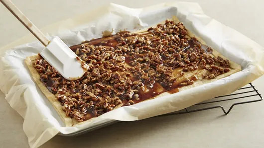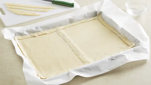 Step1Heat oven to 450°F. Line rectangular pan, 15x10 inches, with cooking parchment paper, allowing edges to overhang 2 inches on 2 sides. Unroll pie crusts. Press crusts in bottom, cutting to fit; moisten seams with finger dipped in water, and press seams firmly to seal. Once bottom of pan is covered, use any additional crust, cut into 1/2-inch strips, along edges of pan to thicken edges (using same method as above). DO NOT PRICK CRUST. Bake 11 to 13 minutes or until golden brown.