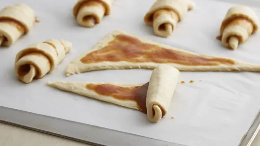 Step2Separate dough into 8 triangles. Spread about a tablespoon of pumpkin mixture onto each triangle. Roll up loosely starting at shortest side of triangle, rolling to opposite point.