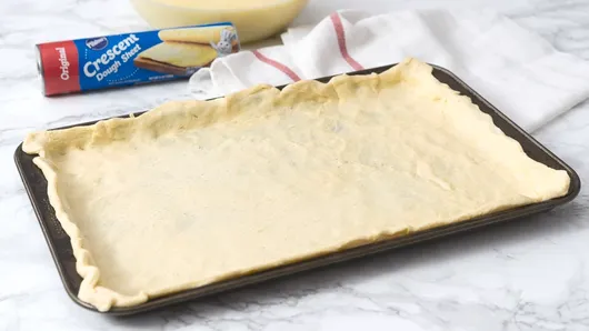 Step2Lightly spray 13x10-inch rimmed baking sheet with cooking spray. Press 1 can (12 oz) Pillsbury™ Grands!™ Original Crescent Rolls evenly in bottom and up sides of baking sheet.