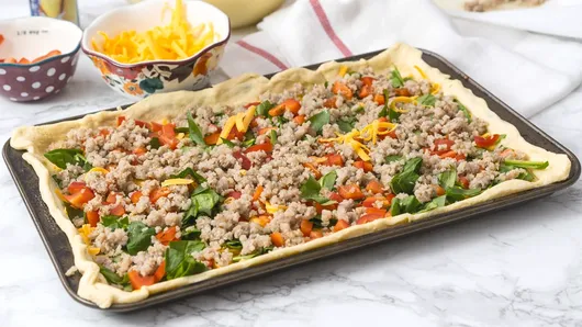 Step3Sprinkle 1 cup crumbled browned cooked pork sausage, 1 red bell pepper, diced, 1 cup baby spinach, roughly torn and 1 cup shredded Cheddar cheese (8 oz) over dough; set aside.