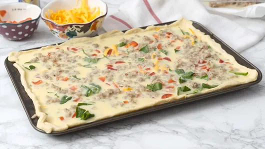 The easiest way to make eggs for a crowd? Bake them in a sheet pan! This crescent-crusted quiche with sausage, peppers and spinach serves 10 in just 40 minutes.