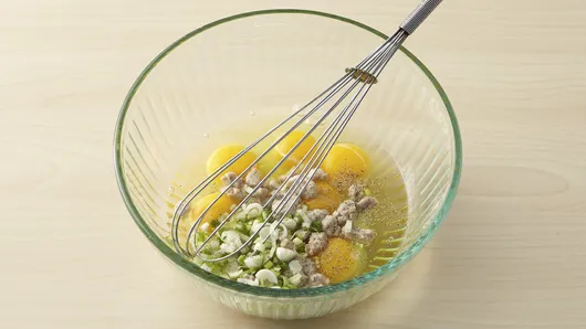 Step2In medium bowl, beat eggs, sausage crumbles, green onions and pepper with whisk or fork until well mixed.