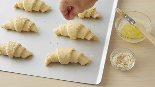 Step1Heat oven to 350°F. Unroll dough; separate into 8 triangles. Roll up as directed on can. In small microwavable bowl, microwave 1 tablespoon of the butter uncovered on High 30 to 40 seconds or until melted. Brush dough with melted butter; sprinkle with sesame seed. Bake as directed on can.