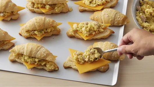 Step4To serve, with serrated knife, cut each crescent in half. Place 1/2 slice cheese onto bottom half of each crescent; top with egg mixture and crescent top. Return crescent sandwiches to cookie sheet. Bake 2 to 3 minutes longer or until cheese is melted. Serve immediately.