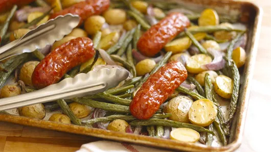 How do you make weeknight dinner easy? Throw everything on a sheet pan, and it’s ready in no time. This easy sheet-pan dinner combines sausage, green beans, onion and potatoes for a well-rounded dinner the whole family will enjoy.
