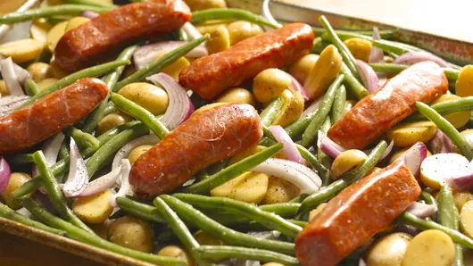Step2In rimmed sheet pan, arrange 1 lb baby potatoes, halved, 1 lb green beans, trimmed, and 1 red onion, sliced. Drizzle with 2 tablespoons olive oil. Season with salt and pepper; toss to coat. Top with 1 lb sweet or hot Italian sausage links.