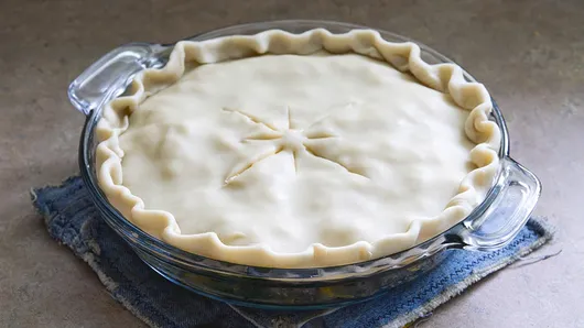 Step5Unroll pie crust; place over filling. Flute pie crust edge; cut small slits in several places in crust to vent.