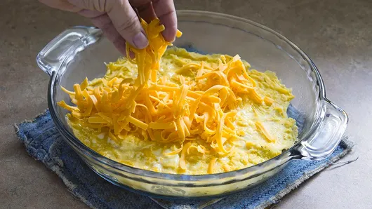 Step2In medium bowl, beat 4 of the eggs with fork; add salt and pepper to taste. In 9-inch omelet pan or skillet, heat 1 teaspoon of the olive oil over low heat. Add eggs; swirl pan to coat bottom with eggs. Once eggs begin to firm up, use rubber spatula to lift uncooked to bottom of pan. Slide omelet into pie plate. Top omelet with 1 cup of the cheese.