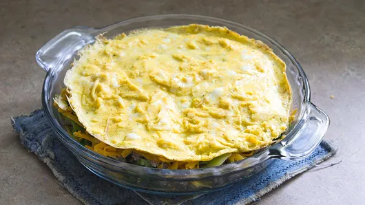 Step4Make second omelet using remaining 4 eggs and adding salt and pepper to taste. Slide into pie plate.