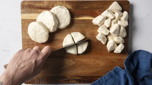 Use a knife or kitchen shears to cut the biscuits into quarters, and place on top of the sausage mixture.