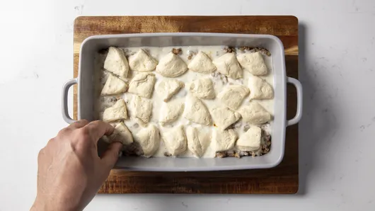 We’ve heard from you that it’s easy to turn this into a one-pan biscuits and gravy casserole by leaving the sausage and gravy in the ovenproof skillet, topping with the biscuits, and placing the skillet in the oven to bake. So smart!