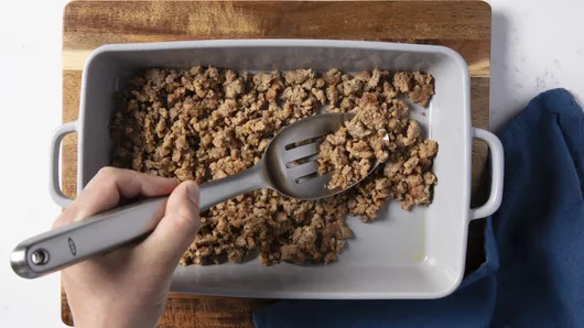 In a nonstick skillet, cook the sausage, breaking up the big clumps with the back of a spoon, for about 8 to 10 minutes or until cooked through. Use a slotted spoon to lift the sausage out of the drippings and into the baking dish.